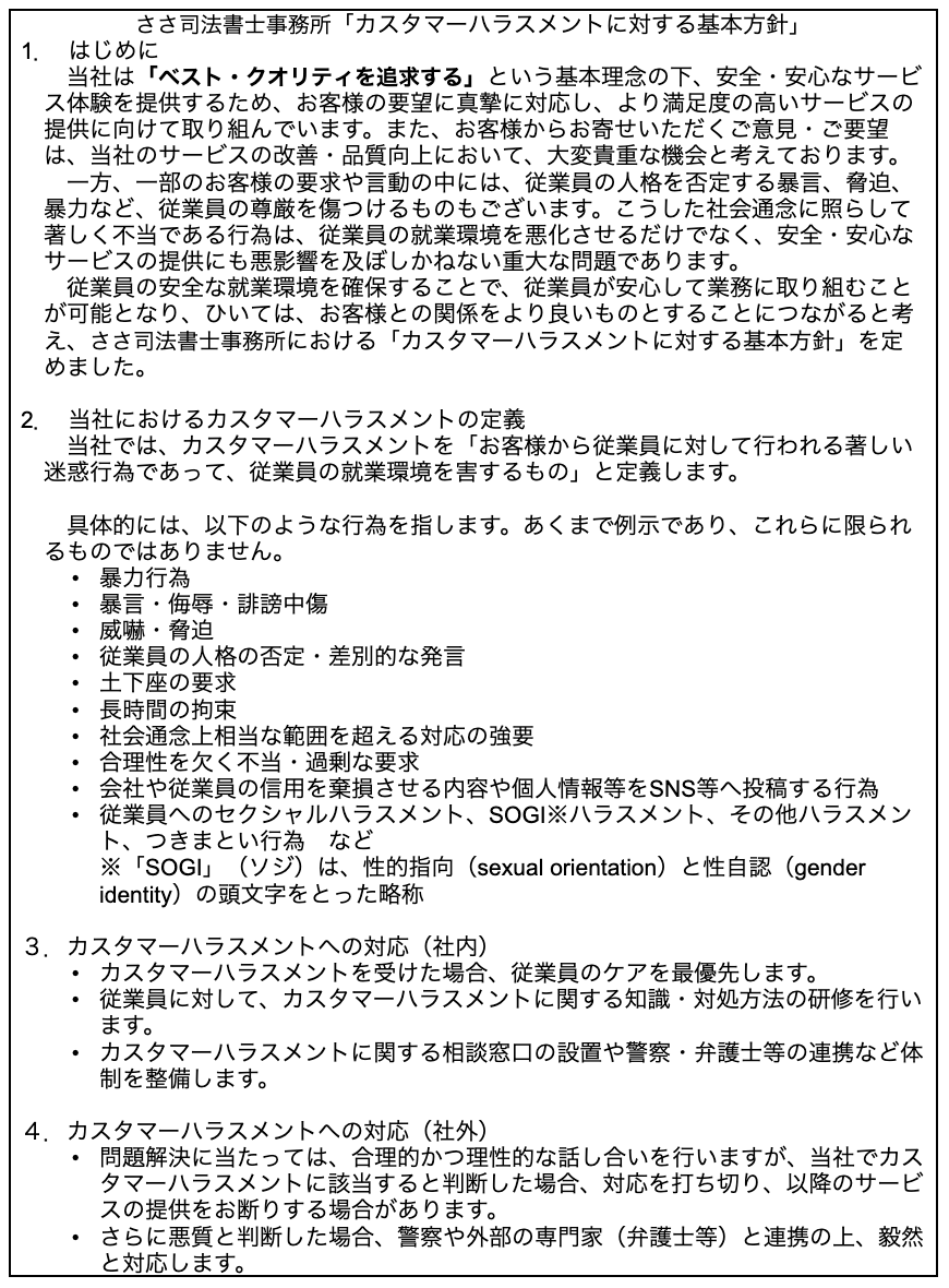 ささ司法書士事務所では、以下の「カスタマーハラスメントに対する基本方針」に基づき、カスタマーハラスメントに対して、組織として適切に対応いたします。